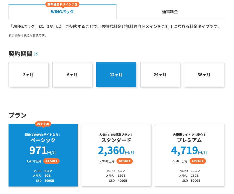 - 料金タイプ: 「WINGパック」を選択(ドメインが無料になるため絶対こちら!)