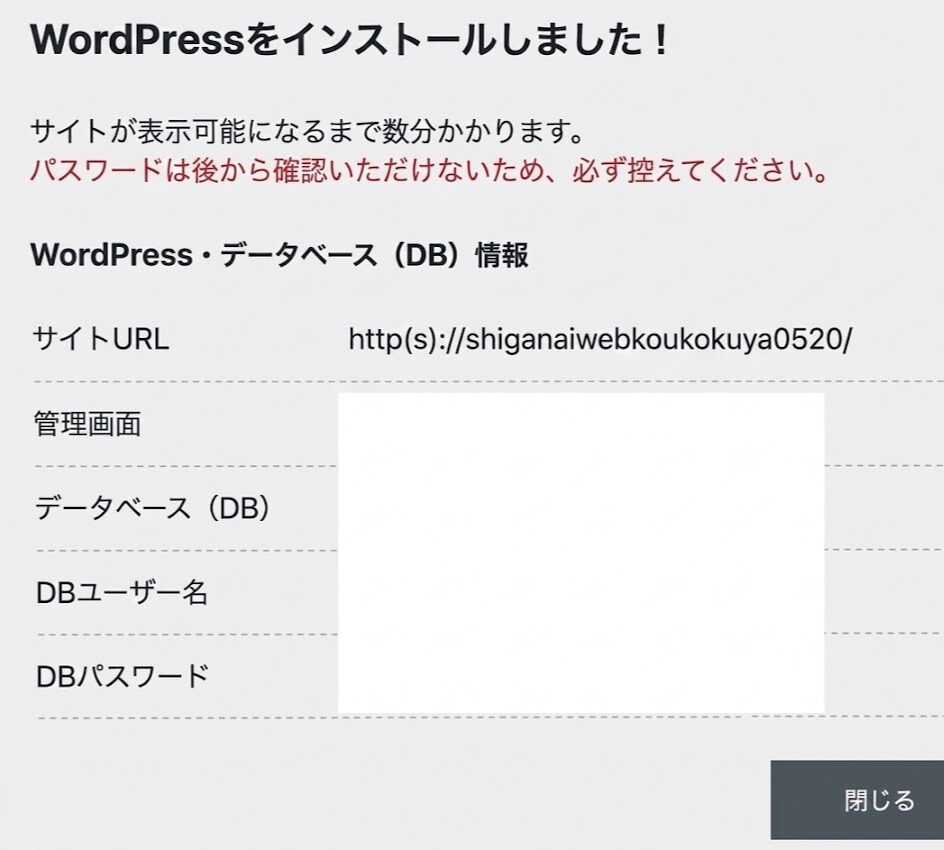 - WordPressユーザー名・パスワード: WordPressの管理画面にログインするための重要な情報です。必ずメモしておきましょう。
