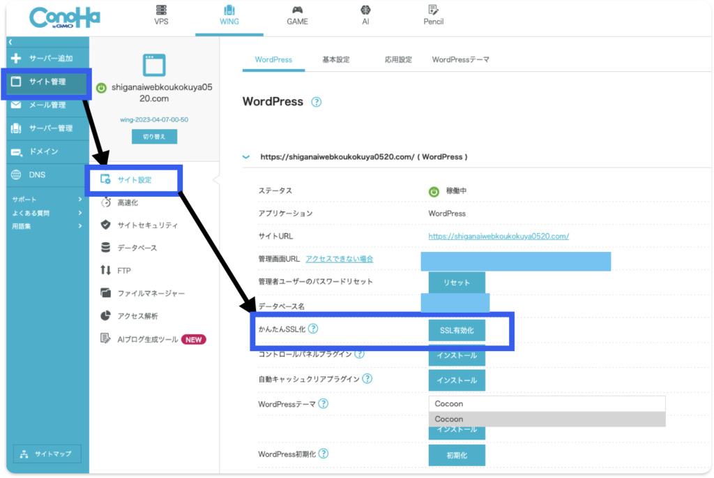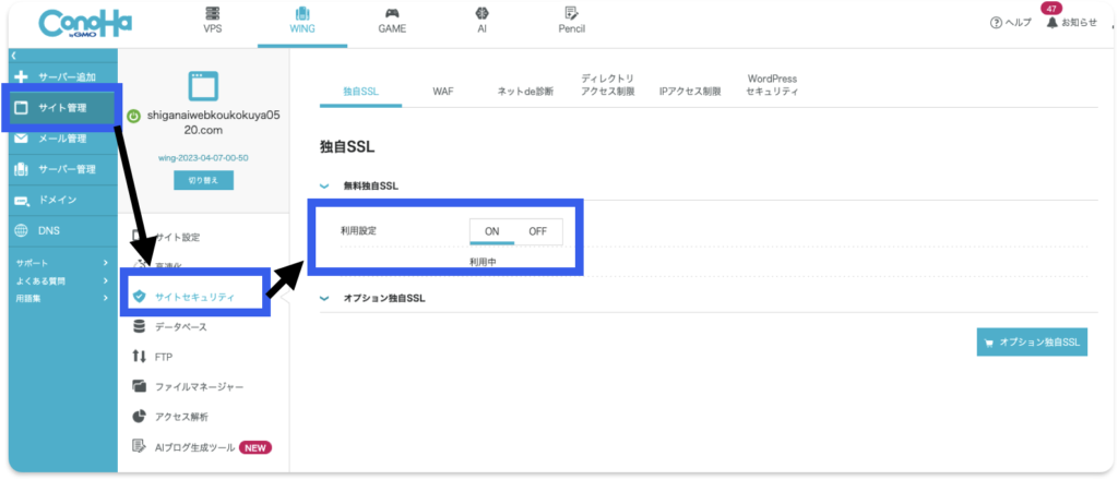 申し込みが完了したら、そのまま上記URLからConoHa WINGの管理画面(コントロールパネル)に入ります。 ここで絶対にやっておくべきなのが、サイトのURLを「http」から「https」にする「SSL化(通信の暗号化)」です。