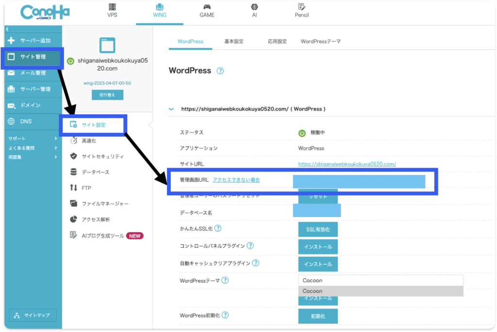 - 先ほどと同じConoHaの管理画面(「サイト管理」>「サイト設定」>「WordPress」(デフォルトWordPressをひらけていると思います。)を開きます。