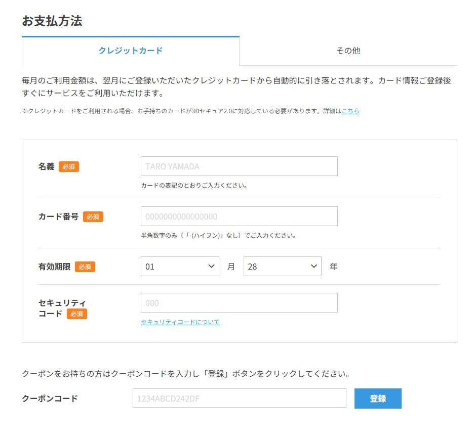 最後に、名前や住所などの必須項目と、支払い情報(クレジットカード等)を入力して次のページで「お申し込み」ボタンを押せば完了です!