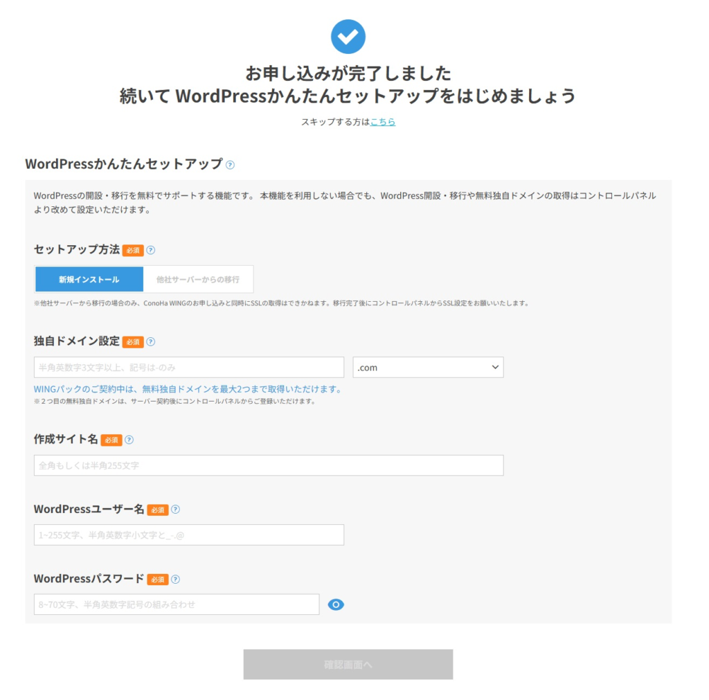 ここがConoHa WINGの最大の目玉です。以下の項目を入力するだけで、WordPressが自動構築されます。