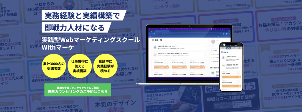 「いきなり転職ではなく、まずは副業から始めたい」「広告だけでなく、ブログやSNSも広く知りたい」「まずは軽くWEB広告の全体像など基礎的な所からどうしても始めたい」という方にはWithマーケさんが最適です。