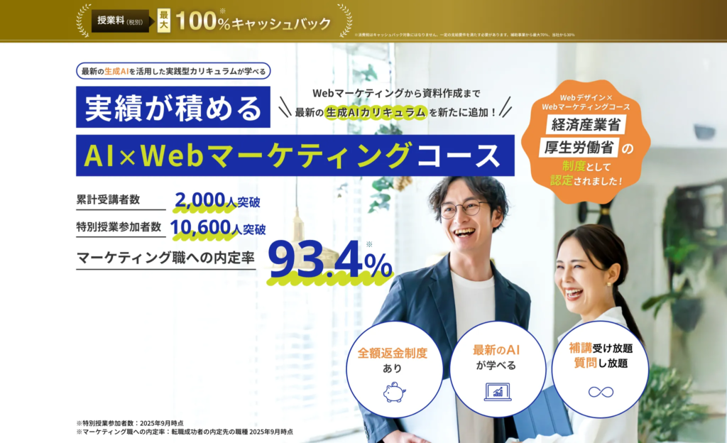 - 学び放題: 広告運用だけでなく、SEOやSNSマーケティングなど、Web全体の幅広い知識をコスパ良く学べます。